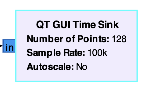 Der “QT GUI Time Sink” Block ein Ausgabe-Block, der dazu dient, die zeitliche Darstellung von Signalen in Echtzeit anzuzeigen. Das Signal wird im Zeitbereich dargestellt. Das Signal im Zeitbereich wird aus den gesampleten Werten zusammengesetzt. Je mehr Samplepoints desto genauer ist die Signaldarstellung. In diesem Beispiel wurde ein 10kHz Signal (Periodendauer ist 0.1ms) mit 10facher